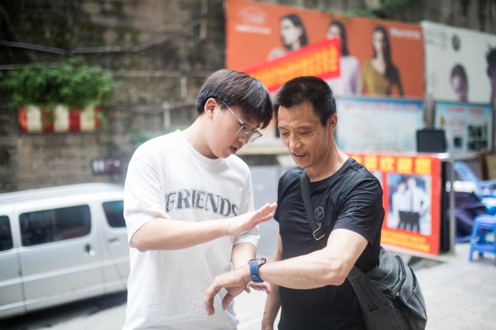 在重庆朝天门批发市场,冉光辉(右)戴上儿子冉俊超送的手表(2025年6月14日摄)。新华社发(许康平摄)