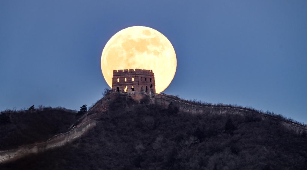 1月3日在北京市密云区古北口镇拍摄的蟠龙山长城二十四眼楼与月亮。