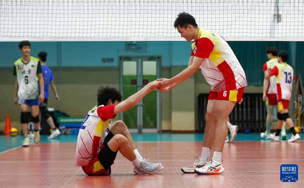↑北京景山学校排球队高中组球员陈宣霖(前右)在训练赛中扶起队友