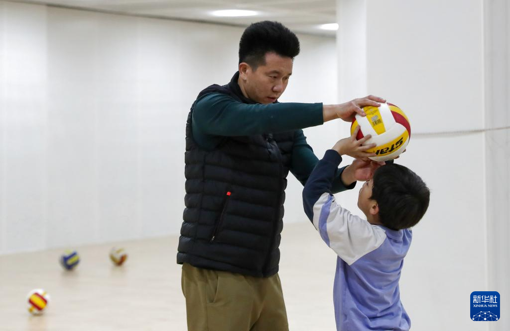 ↑北京景山学校排球队小学组主教练尹晓光(左)在训练中指导球员