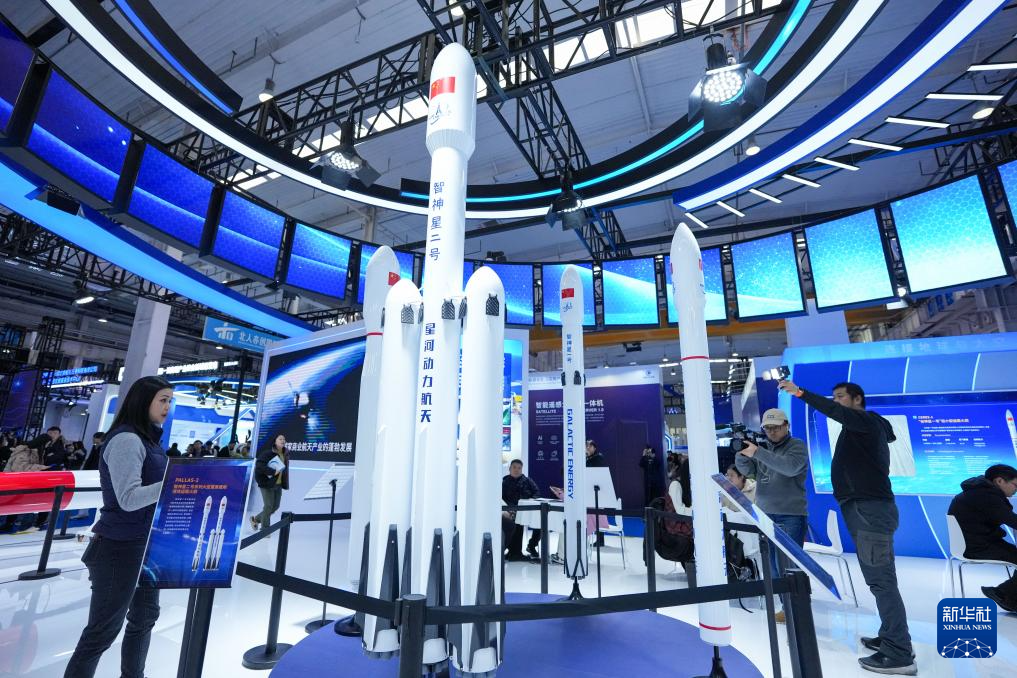 1月23日,观众在2026北京国际商业航天展的星河动力航天展台参观展出的火箭模型。
