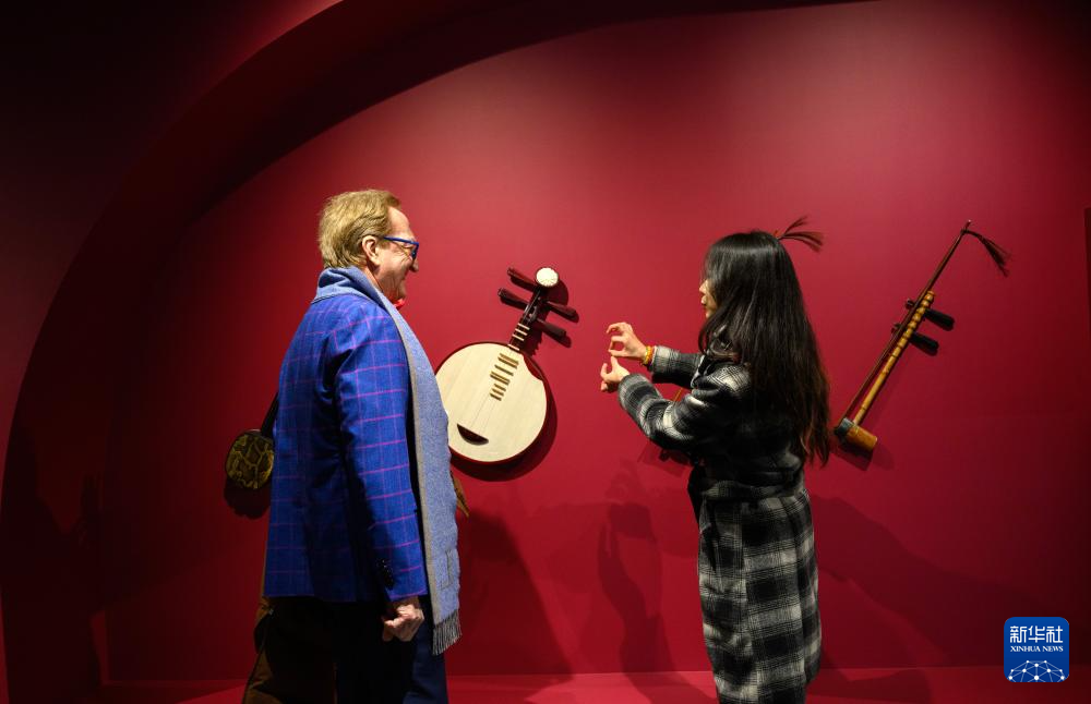 1月26日,在北京市朝阳区戏曲艺术中心,中外观众参观“百年风华·国粹新声”京剧艺术主题展上展出的乐器。