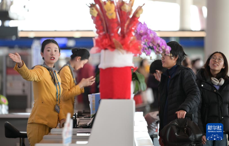 2月2日,北京首都国际机场旅客服务中心工作人员为旅客提供指引、咨询等服务。