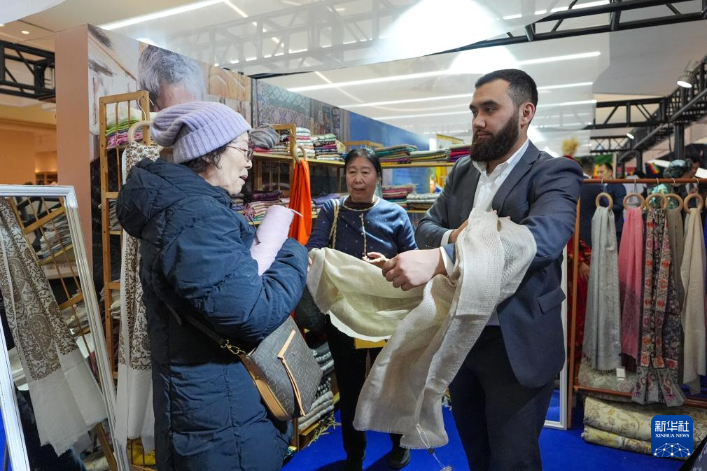 2月4日,在“共享大市场·出口中国”2026年首场活动暨北京国际精品荟的进口商品推介区,参观者(左)购买展出的乌兹别克斯坦围巾。