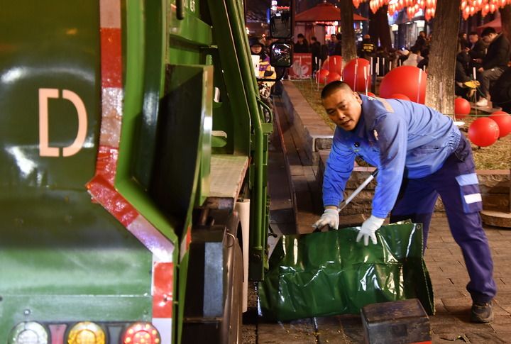 2月4日,在簋街清运多年的李宁,装运完垃圾后清理环境。新华每日电讯记者李欣 摄