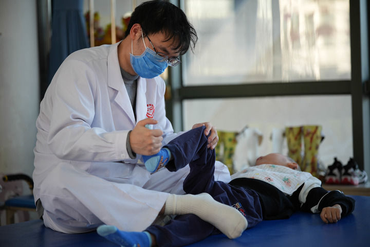 2月5日,一位福利院的老师正在给孩子进行肢体康复训练。新华每日电讯记者谢晗 摄