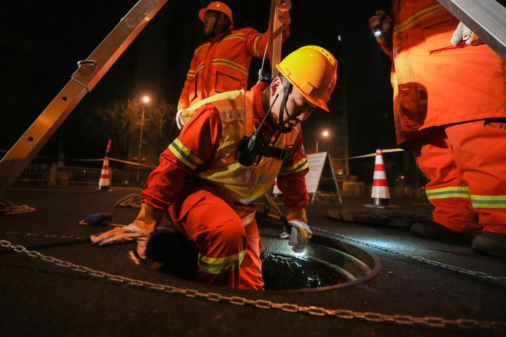白天人多车密,深夜才是管网维护的“主战场”。下井前,班组在井口拉好警示带,摆好反光锥。井盖掀开,热气与冷空气凝成薄雾。按照安全作业的铁律——“先通风、再检测、后作业”,班组先是对小室进行30分钟通风置换,随后将检测仪探入井下:“氧气含量20.9%,一氧化碳、硫化氢和易燃易爆气体含量均为零——合格!”
