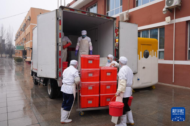 3月2日,首都师范大学附属小学工作人员将食堂做好的饭菜装车,准备送往该校柳明校区,实现“校校有食堂”。