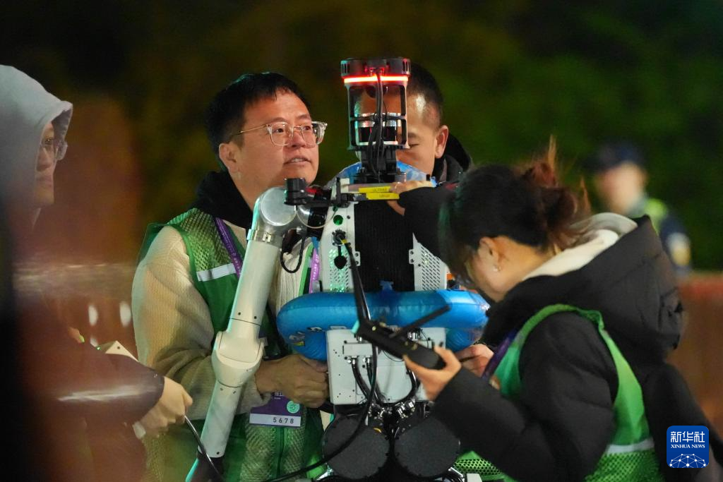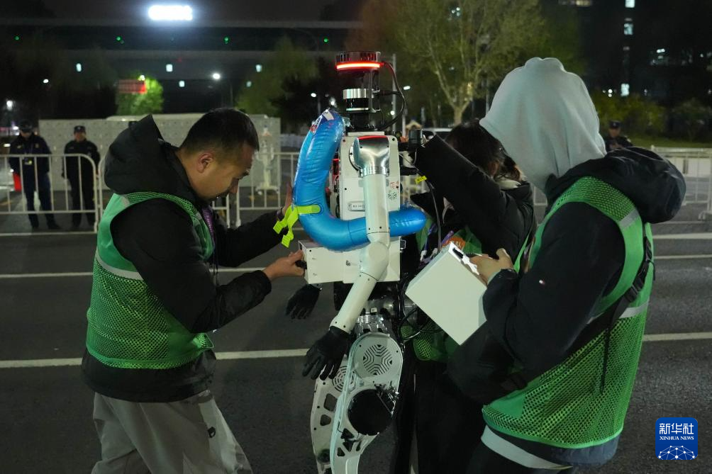 4月12日凌晨,操作人员在调试一台参加全要素测试的机器人。新华社发(翟一凡摄)