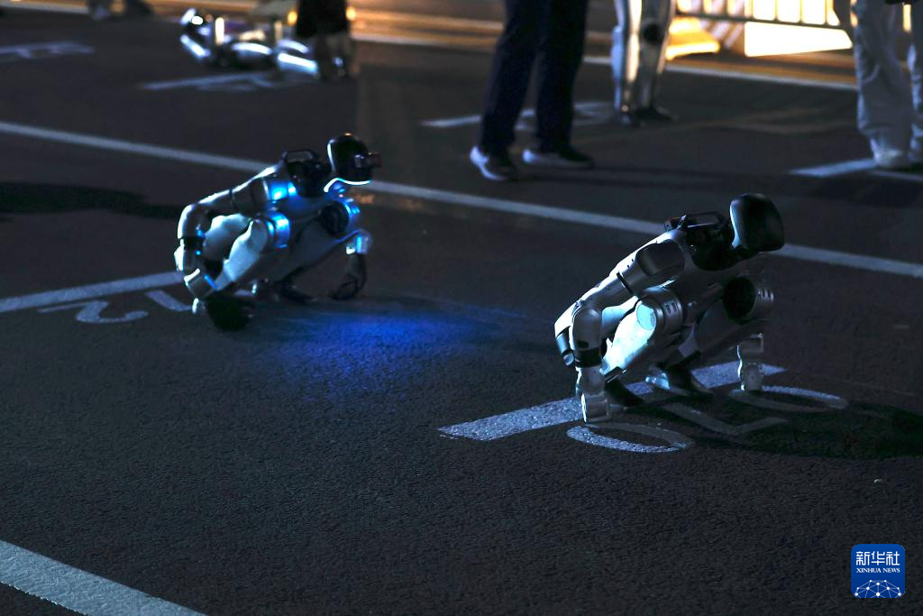 4月11日,两台机器人在测试活动中准备起跑。新华社发(翟一凡摄)