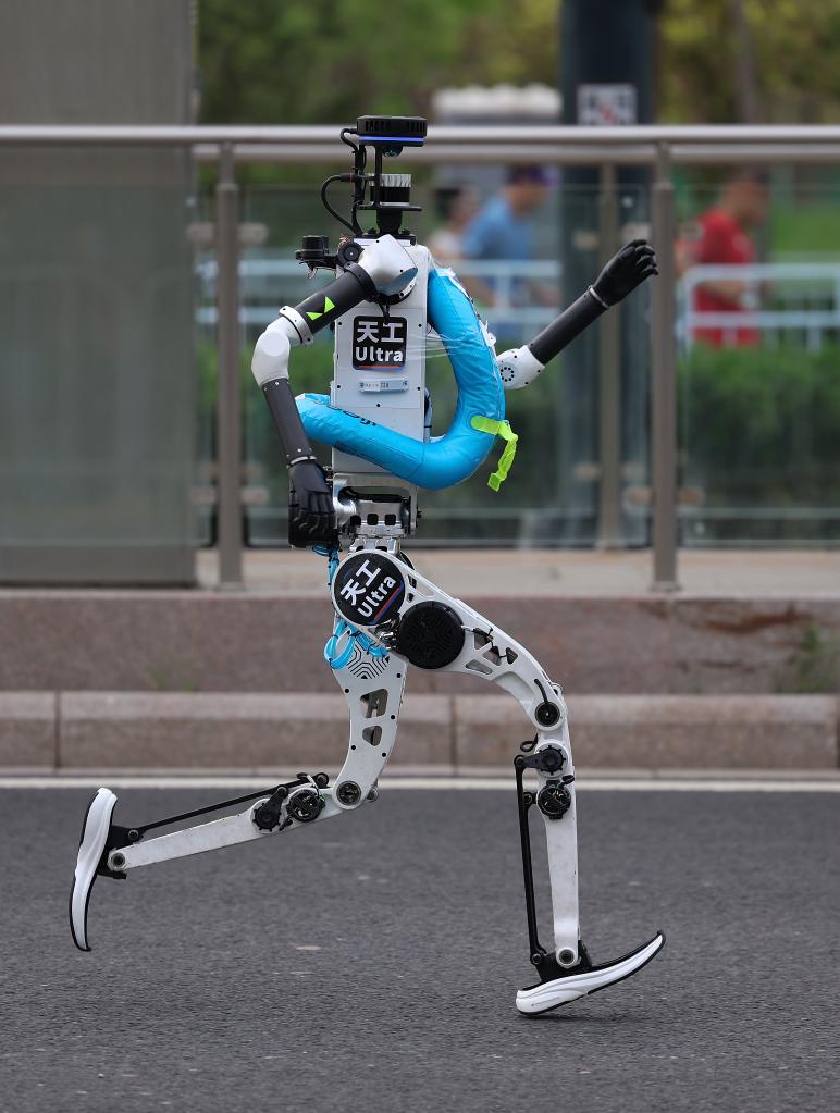 4月19日,天骁队自主人形机器人选手天工1.0Ultra在比赛中。