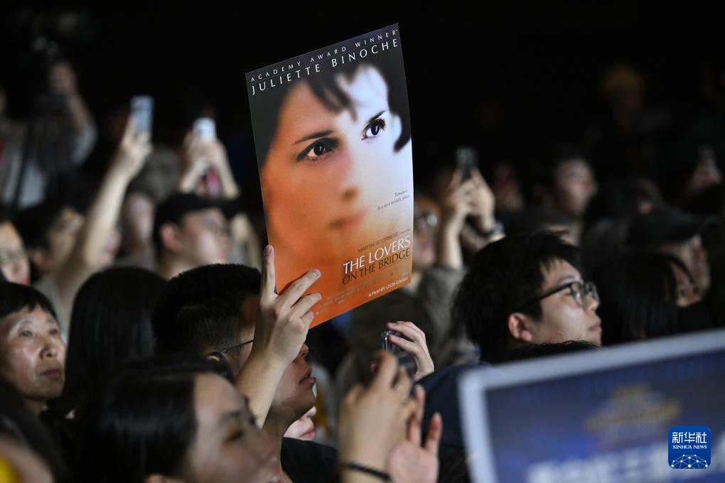4月24日,影迷在活动中手举朱丽叶·比诺什主演的电影《新桥恋人》的海报。